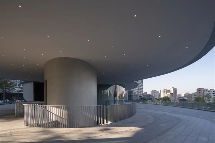 在狭窄的三角形场地范围内,三座蘑菇形建筑物落在了地下和半地下空间之上;二层的“蘑菇体”体块从结构体往外悬挑,彼此相连成序列展厅。展厅空间覆盖之下的开放空则向城市开放,为未来城市提供连续和流动的地面架空广场。建筑让所有的城市文化活动悬置与城市广场之上,并为全新的高密度社区提供了三束如村口榕树或者凉亭一般的舒群基础空间。