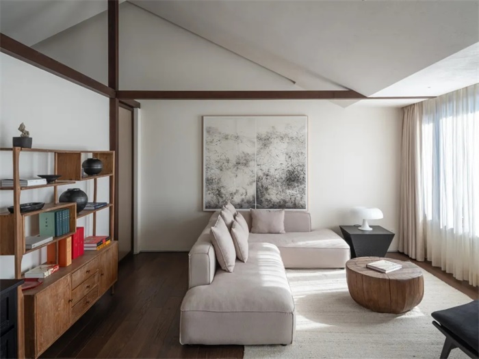 在这个建筑群落中,既有中国传统木构古建筑,也有现代结构的建筑,它们原本的室内氛围是不同的,但是它们作为一个新整合的酒店,又需要一定的协调感和整体感。最终采取的办法是在室内加入一个次一级的木梁构架系统,用以调节室内空间的分隔、尺度与氛围,在室内形成一个可以绕着柱子或者避开柱子行动的空间,这样人的身体动作与在古建中遇到木柱的避让动作可能有类似的体验,希望由此形成一种类似性与亲切感。