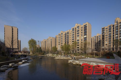 本项目基地分为东西两个地块。基地东侧及西侧道路两侧均有30米城市绿化带,西侧地块中有规划的城市公园用地,面积达2.9公顷,这些大面积绿化用地使东西两个地块具有天然的景观绿化优势。设计中充分考虑这些优势因素,力图创造一种融合的区域景观体系,将城市公共绿地和社区内景观绿化充分结合,有机互补,通过一条贯穿用地东西地块的中央景观绿化带将社区绿化串联成一个庞大的社区绿化系统,同时通过这条中央景观带将东西两部分的城市公共绿化联系起来,形成一个充满活力的城市区域景观绿化体系。绿化景观从中央景观带向周边组团渗透,形成支线景观系统,串联各个组团景观和组团内邻里交流空间。使整个社区9个各具特色的组团相互联通又各自独立,开放中不失私密和归属感。中央景观带及各重要景观绿化节点均设计了具有特色的水景空间,各个组团内部的邻里交流空间、广场均有水景设计,特别是中央景观带中设计了一条连贯东西的水系景观,并在水系两侧设置蜿蜒回曲的人行景观步道和亲水平台,使社区居民能够在休闲、散步、归家的途中体验溪流、叠瀑、喷泉等等特色水景,突出体现了社区的滨水景观优势,遵循顺义新城滨水而居的规划目标。