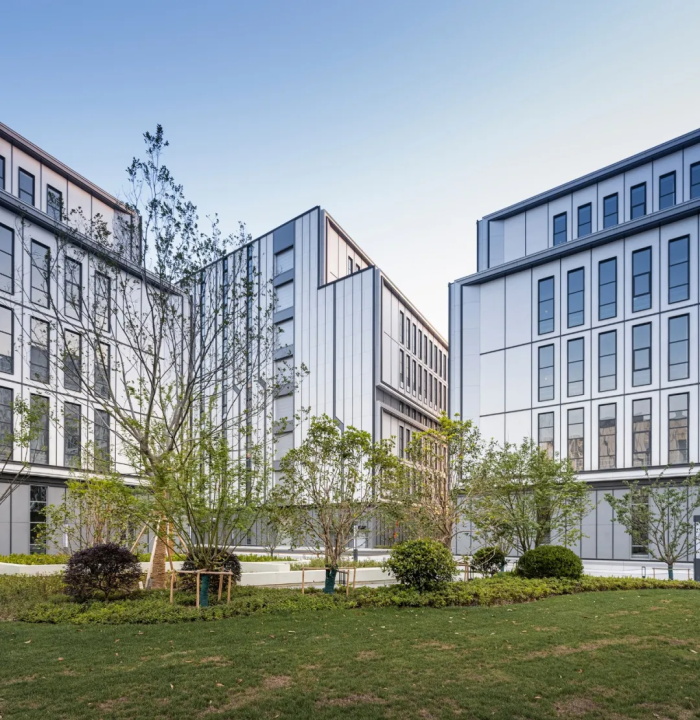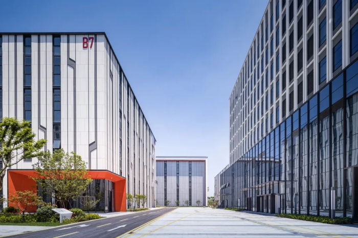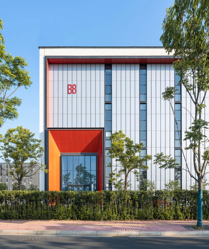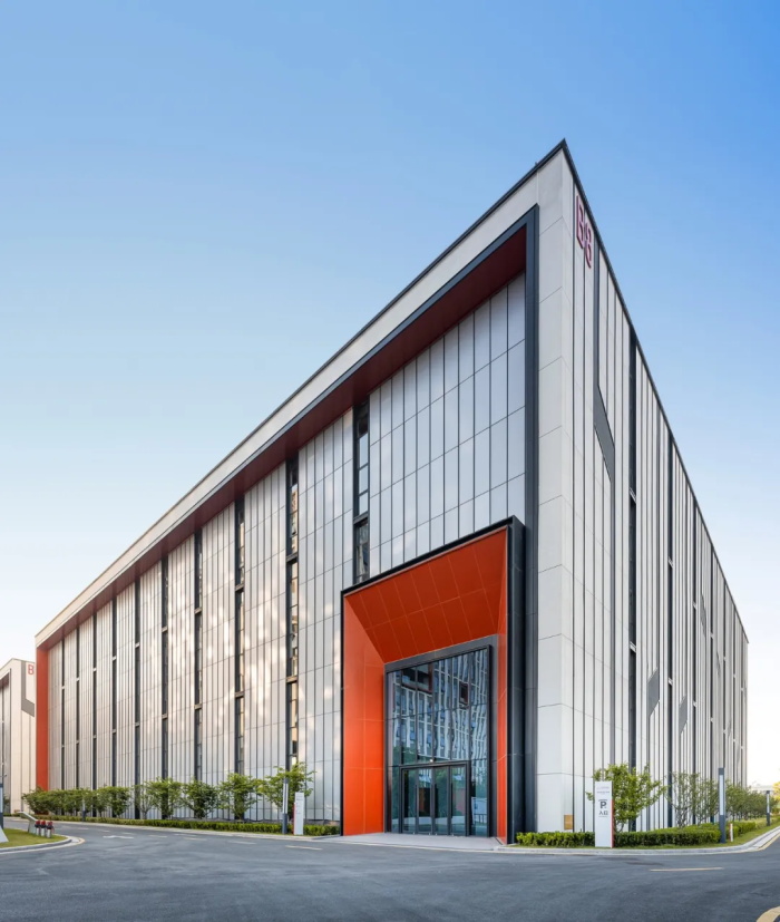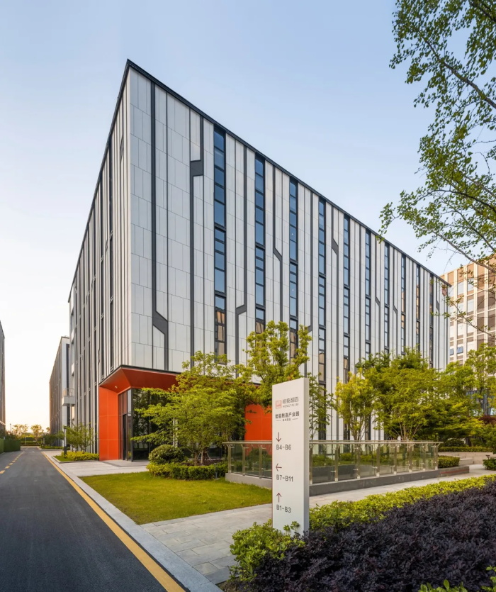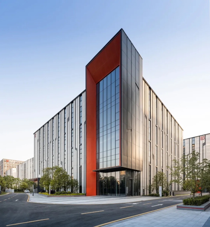 厂房主立面选择银灰色金属一体板材质,打破了传统工业厂房“低成本、低质感”的既有印象。挺拔的立面序列和细腻的金属质感,既保证了成本控制,也赋予建筑以现代工业的审美辨识度,充分体现了面向高端制造企业的空间品质要求。