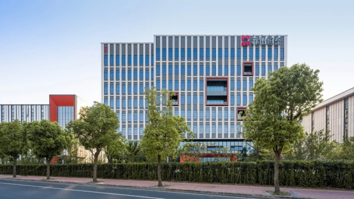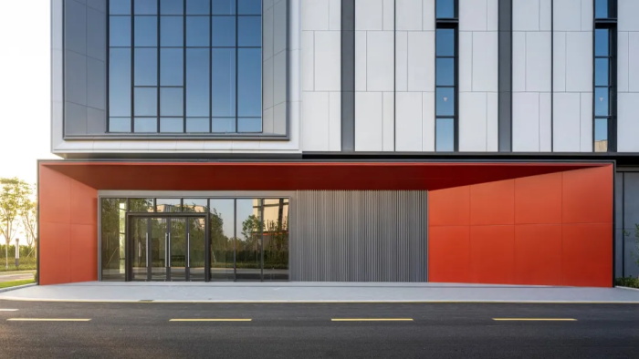 以现代、科技、理性为主线,FTA集团通过材质与构造细节精准传达其产业属性与空间气质。在端部立面设计中,采用灰-白色铝板与高通透玻璃幕墙相结合,营造出冷静克制的建筑色调,入口上方的大面积玻璃开窗设计则为空间带来了轻盈透亮的视觉效果,在体现现代感与科技感之外,也带来轻盈感。