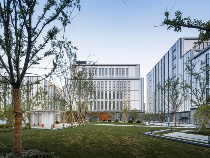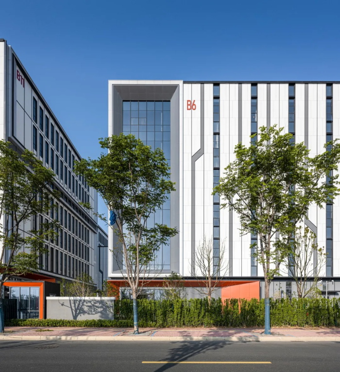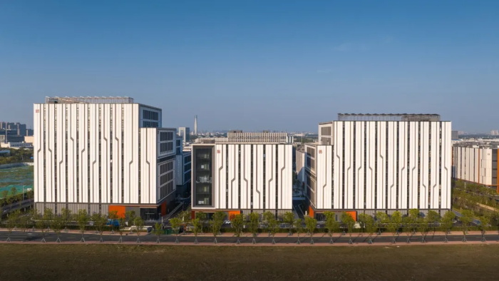 研发办公楼临城市界面布置,采用“智慧处理器”作为立面构图的设计灵感,通过纵横交错的银白色线条与不规则矩形视窗组合,呈现出如芯片般富含逻辑与精密感的形象语言:象征着楼宇在产业体系中的“核心功能”,也成为区域内极具视觉记忆点的标志性立面。