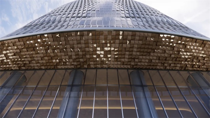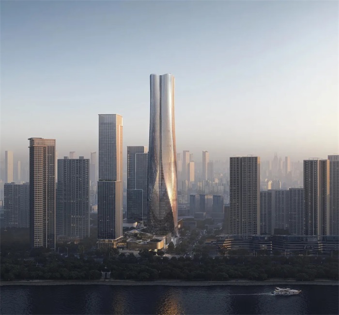颇具标志性的超高层塔楼从下到上逐渐收分变细,呈流体纺锤形态,体现出商务办公体量和酒店体量所对应的业态空间进深需求之间差异的过渡与融合。超高层建筑表皮由参数化设计研究生成,通过优化异型曲面,从而实现表皮效果与幕墙经济性的平衡,兼具雕塑感和理性逻辑的建筑形制呼应基地周边长江的力量与动感,形成了统一、富于张力的建筑语汇。