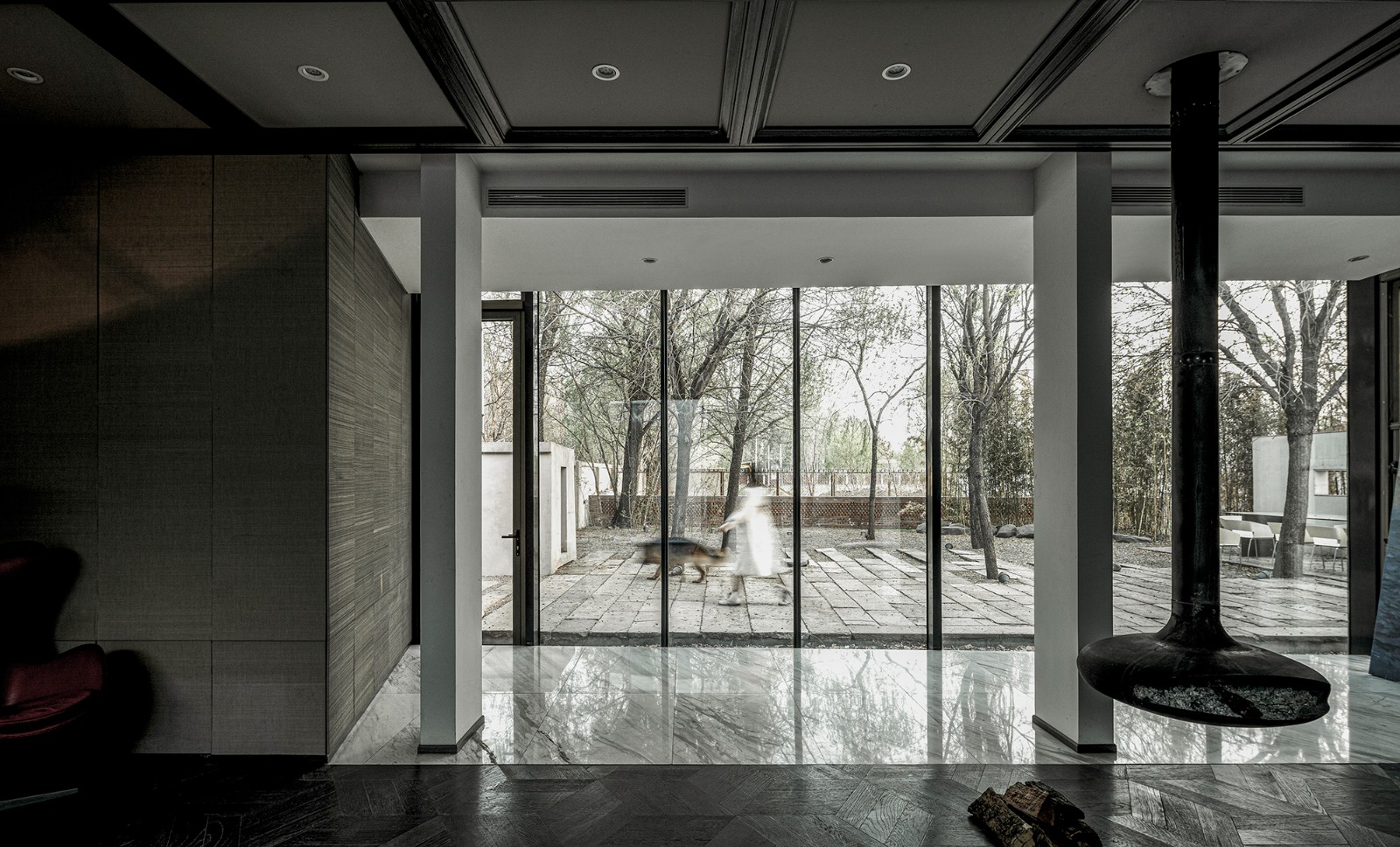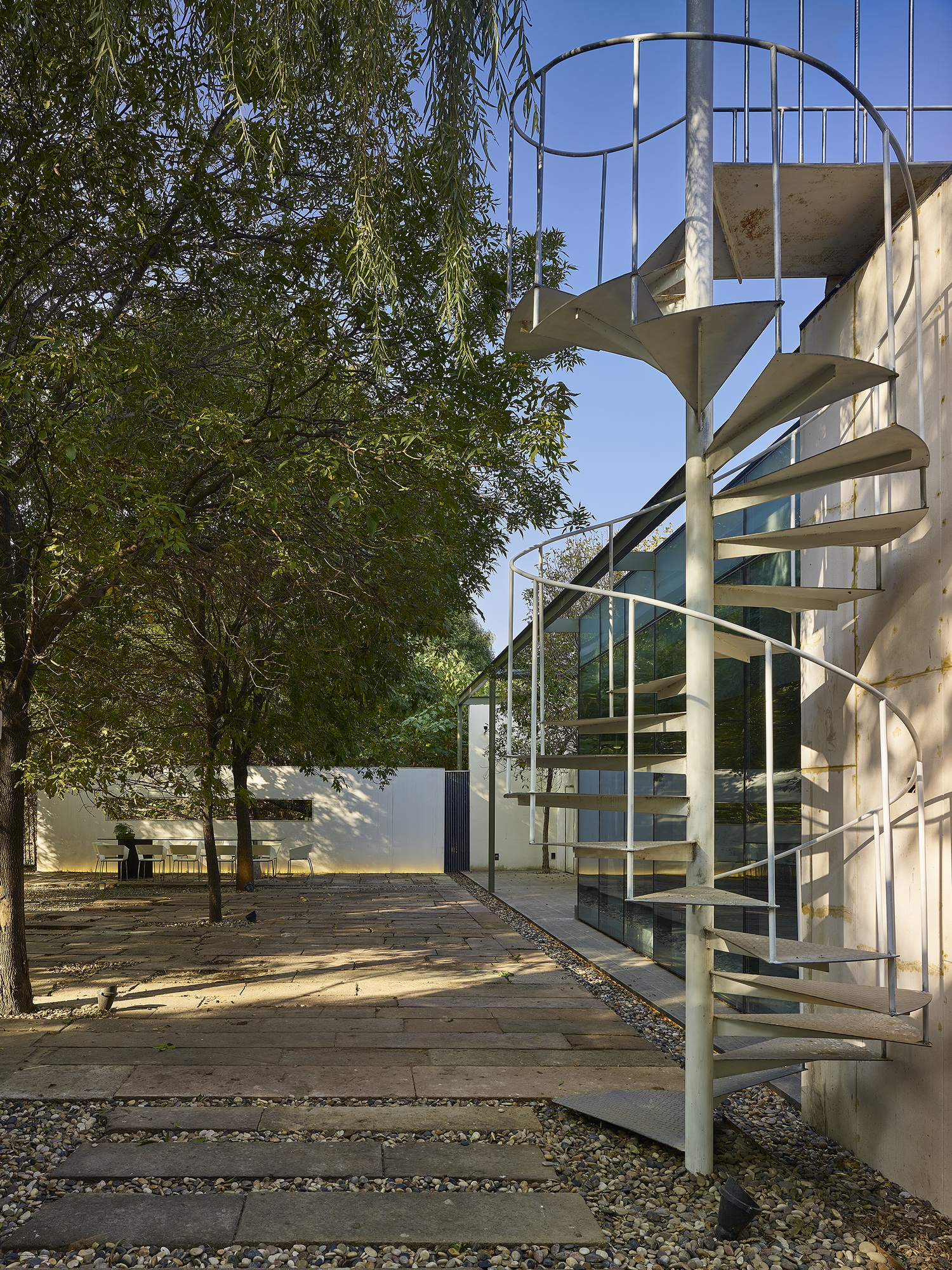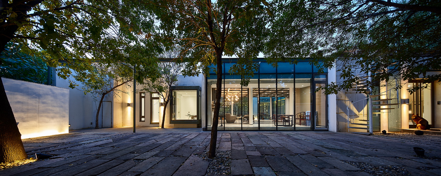 房屋南侧的庭院可供日常闲暇和聚会场地使用,地面使用从安徽收集到的明清时期老建筑庭院里的老石条铺就,院内保留原有树木花草,营造出古朴、轻松自在的场地氛围。