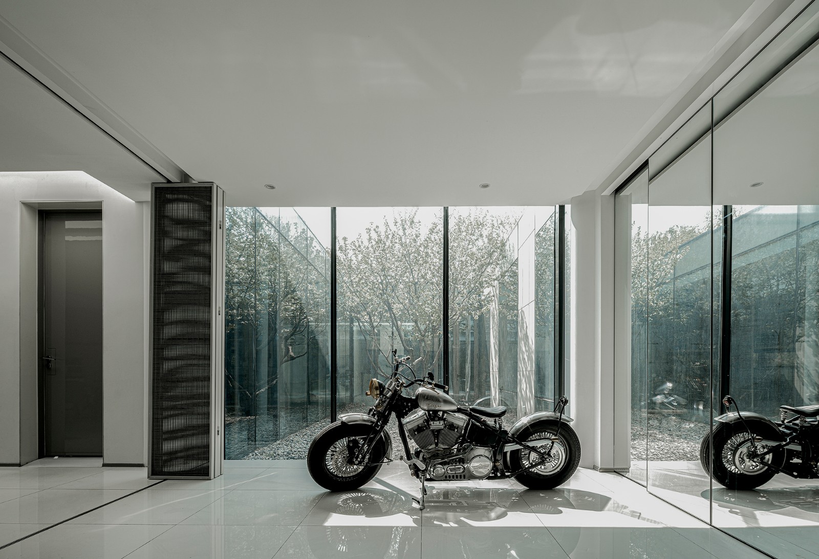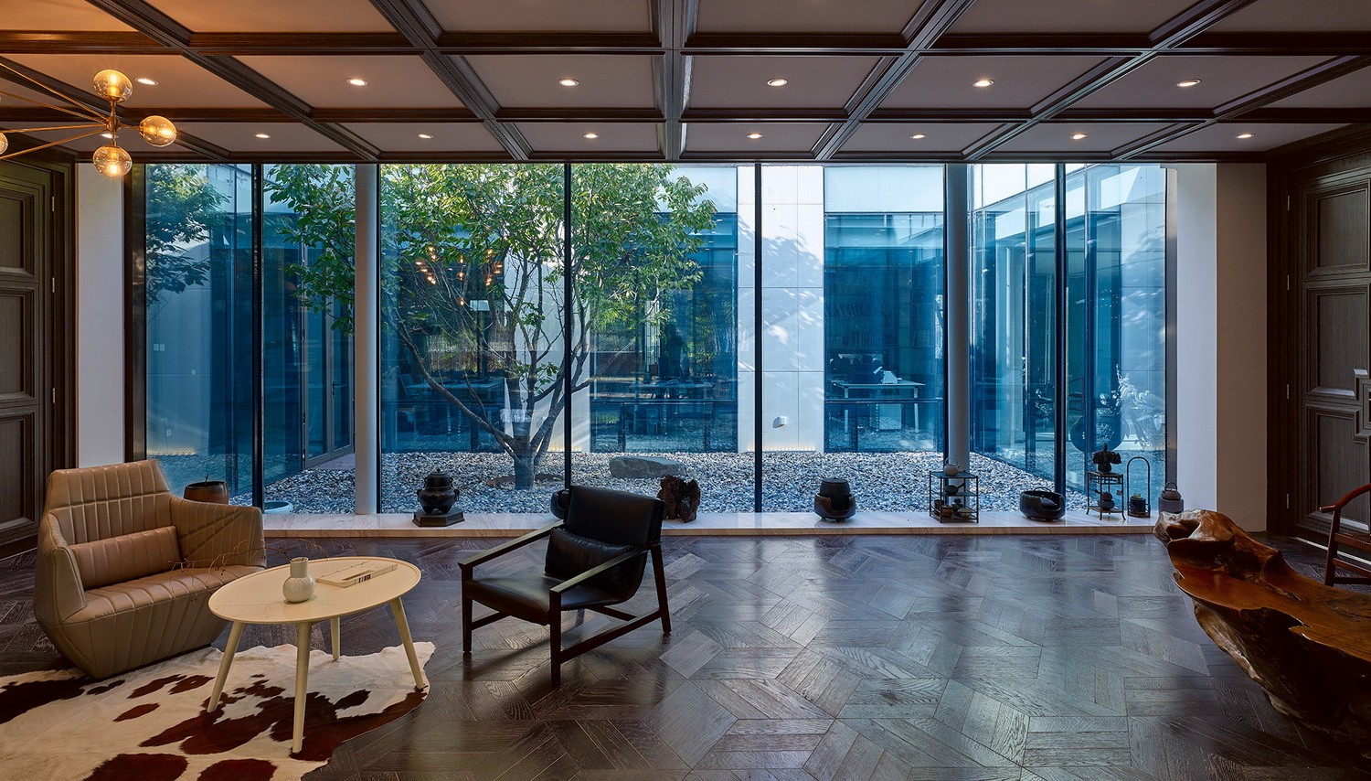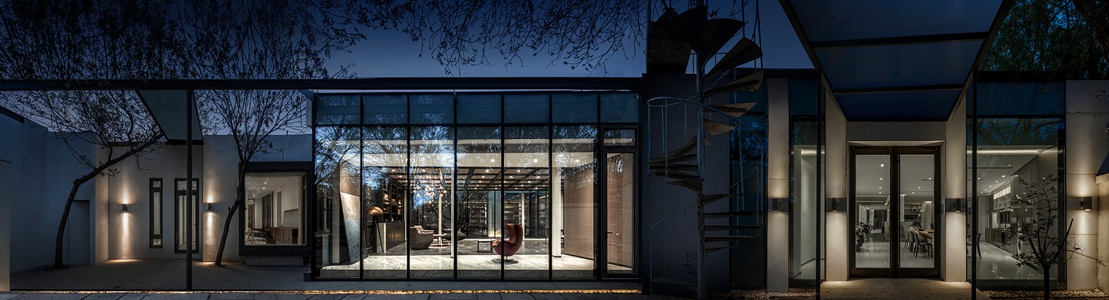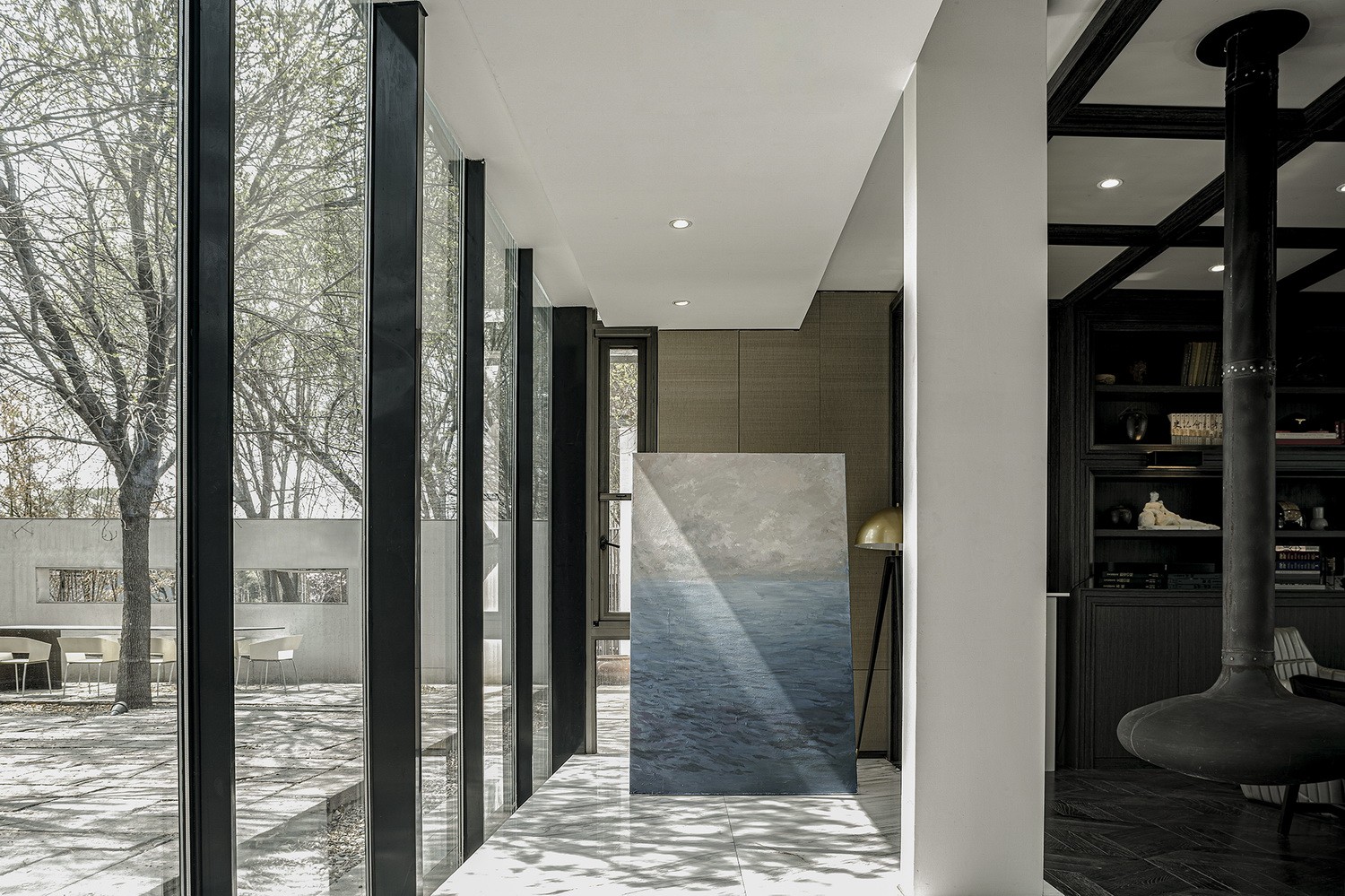 房屋南侧的庭院可供日常闲暇和聚会场地使用,地面使用从安徽收集到的明清时期老建筑庭院里的老石条铺就,院内保留原有树木花草,营造出古朴、轻松自在的场地氛围。