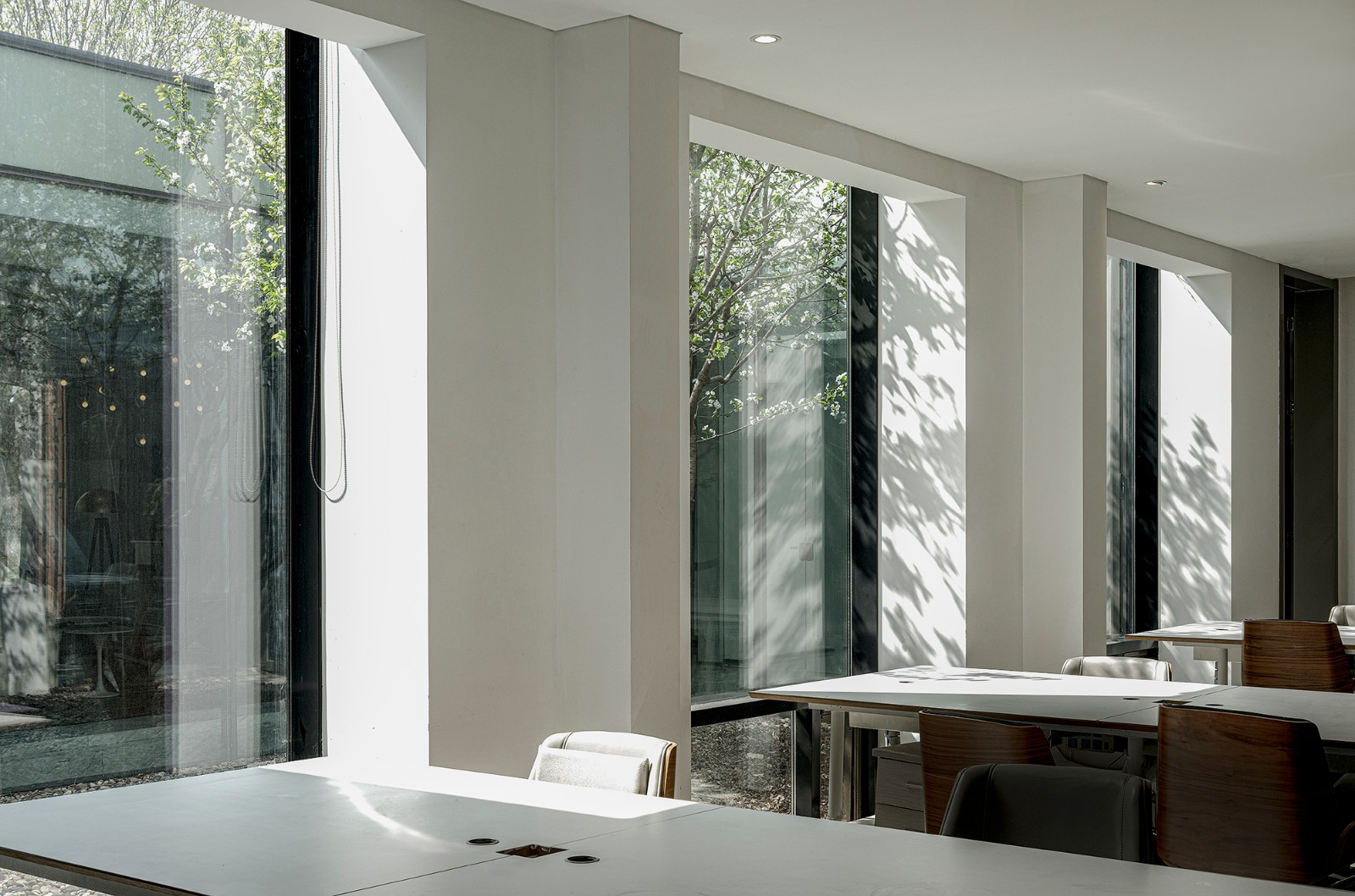 新建筑主体结构采用可回收的钢结构和3层中空加 lov-E玻璃幕墙,使用节能空气源系统采暖和制冷, 房屋的外墙和屋顶安装了足够厚度的保温层,保证全年时间段的节能减排。在建筑内部无窗房间预留了采 光天窗,节约用电消耗。另外,开敞式办公区域南向全部采用落地窗,使用者可以充分感受阳光的温暖和 庭院中的自然景观。