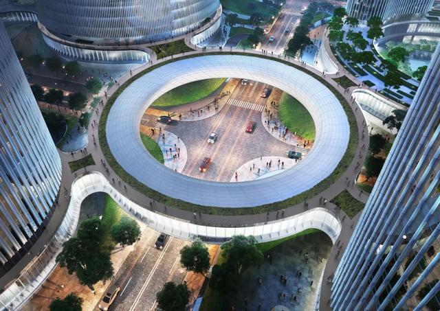 位于项目塔楼之间巨大中央环路,连接着各个圆形体量。鉴于空间跨度之大,结构工程师通过钢框架+局部斜交网格的结构体系作为支撑的最优解,同时中央环路与各塔楼之间采用滑动连接,极大减弱了各塔楼之间的相互影响。