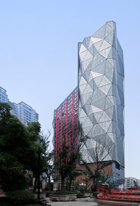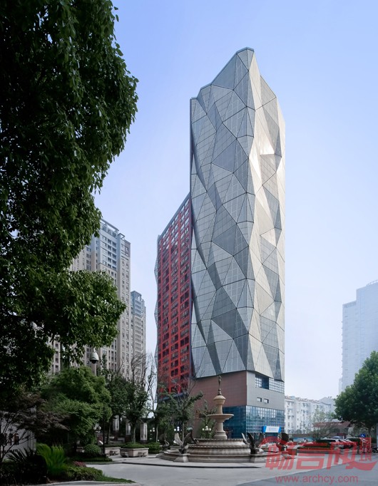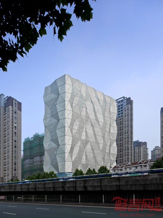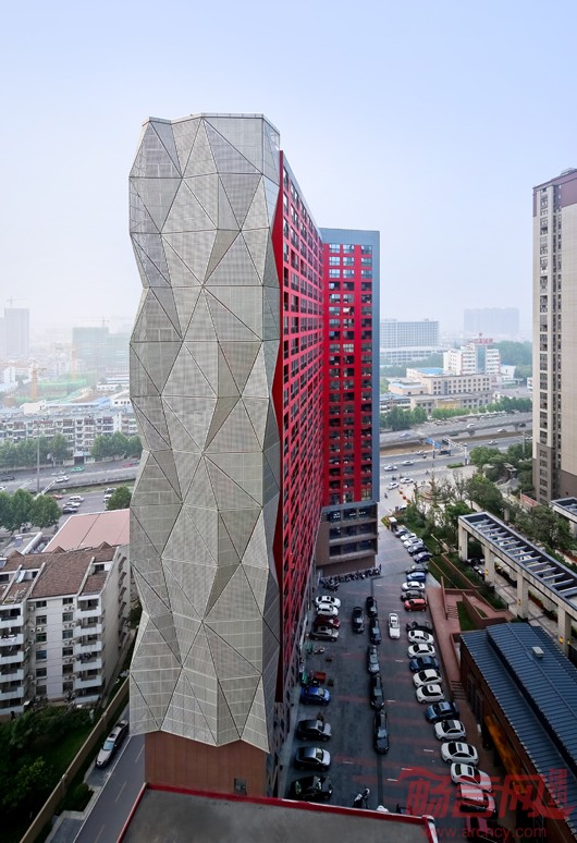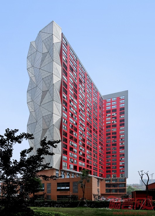 整个建筑外表是层永久性的铝合金骨架,当人们处在一定距离时,窗户本身就不会十分明显,取而代之的是阳光下发光的一系列立体三角金属网架。网格结构表面非常细腻优雅,内部构造十分结实,三角形的几何元素赋予建筑一个强有力的外部形象。公寓楼隔离基地与北侧的高架,因此我们考虑充分发挥穿孔铝板的吸声作用,且材质具有自清洁无光污染,符合城市地标形象。