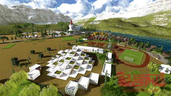 考虑到当地的民居聚落的传统以及本方案的使用性质,我们将规划的意象定位为分散体量形成村落。其中将学校定义为整个区域的精神中心,使主教学楼类似坛城的形制,突出学校教育与宗教的密切关系。主教学楼整个建筑向心布置,围绕着中心展开,逐层退台。坛城的各个屋顶是相互连通的一系列平台,是学生的室外活动空间。层层错落的天窗为教学楼内部提供了充足而且宗教感强烈的光线。