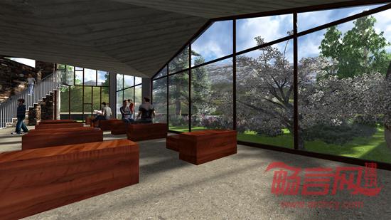 户外空间尽可能大地留出孩子们游戏玩耍的空间,保留场地本身河流冲积的缓坡地形,当地的草地本身已经形成了非常好的室外活动条件。客舍和规划的艺术家村落沿河展开,拥有最好的自然景色。