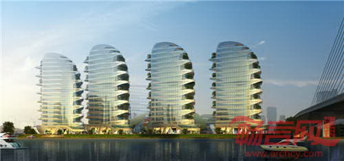 在沿江的几栋高层而言,GPT锋思设计为类似于“船帆”的基本形体,从跨江大桥和江河边上来观察建筑,就犹如一列列船帆在江上流动。从而打造出动感的建筑形态。另外抬高部分基地,使其与南区的商业形成高差,从而容易营造更为高档纯粹的环境。