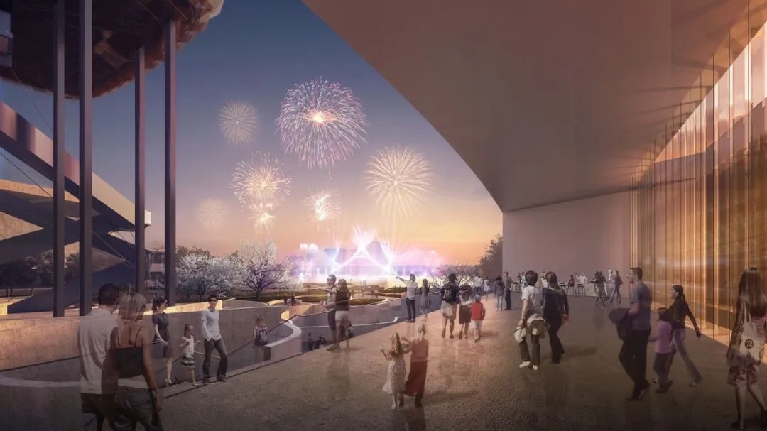 建筑外构被花瓣似的景观铺地和构筑物簇拥。除了供观赏休憩外,不同造型的花瓣作为建筑出入口及标志物,引导人流进入建筑主体;同时结合下沉庭院,花瓣造型中设置了商业、餐厅等经营空间、与公共大厅沉浸式展览、观湖活动一起为后期运营提供了多种途径。