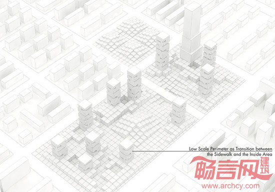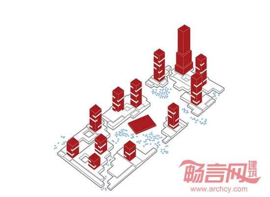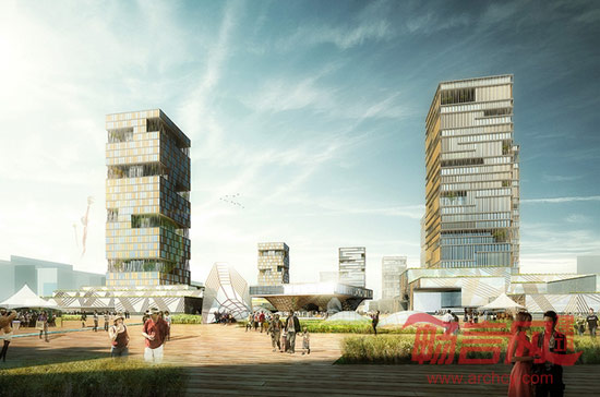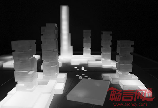 建筑由场地网格生成,呈现出简单的几何形体。最高的塔楼布置东北方向,与东北-西南的主导风向相对应,用来减弱强风对于开放空间和展示馆组群的影响。