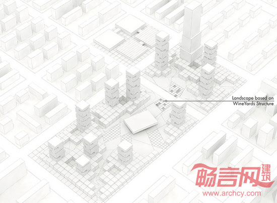 本项目空间原型参考了葡萄园的几何结构,其景观和建筑衍生自一套平面网格,不同的功能也由网格系统组织和关联起来。