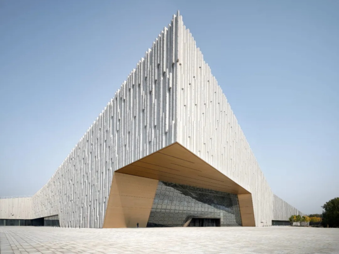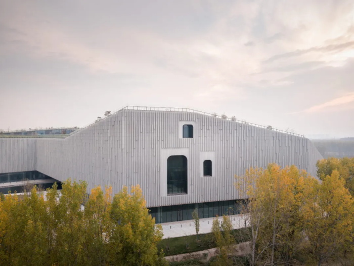 建筑垂直结构的天然石材护墙采用模块化设计,由预制幕墙构件构成,其浮雕般、韵律感的肌理做出流水冲刷的观感。公共区域安装了玻璃采光缝,而主陈展区则做了防光照处理。北侧的三面大尺度开窗仿照黄河洞穴设计,将景观尽收眼底。