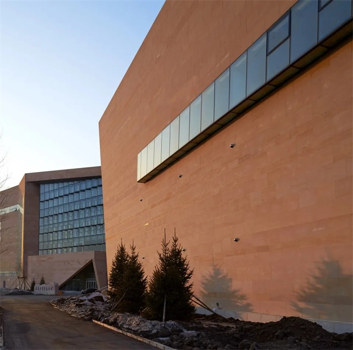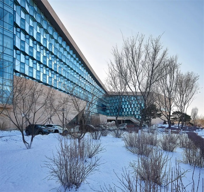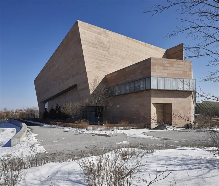 整个建筑远看像是一个被抛入旷野的孤零零的石块,蜷缩在严寒的环境中,在冰雪的冲刷洗礼下成为屹立在整个环境中的原点。而这种“蜷缩”的想象同时暗示着内部的扩张——看似混沌的建筑形态从中间部分被剖开,“迸发”出晶莹灿烂的内核,犹如被打开的幸福宝藏。建筑和寒冷环境通过对抗而相互激活,热情纷繁的内核与粗犷原始的外表皮形成强烈的对比,共同传达出长春市群众艺术馆所应具有的那份厚重和热情。