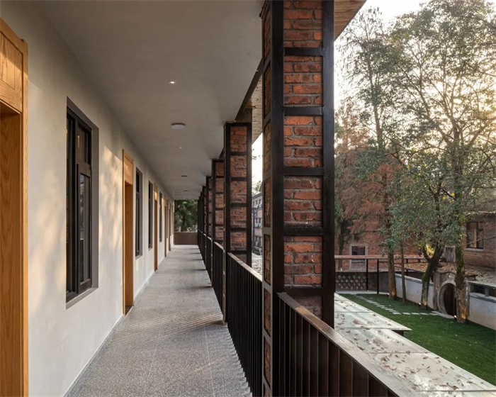 为了保证共享民宿的独立与隐私性,建筑师将原本园区道路与宿舍之间已破损的围墙重新进行了修葺与围合。同时植入了一条风雨回廊,来将前后建筑进行串联。在重塑动线和空间层次的同时也让场地更为整体。建筑师希望回廊在解决风雨遮阳功能的同时,也可以创造出一条游走在各个功能空间与庭院之间的体验动线。通过不同的转折与视角创造出不同的视觉观感与体验感。