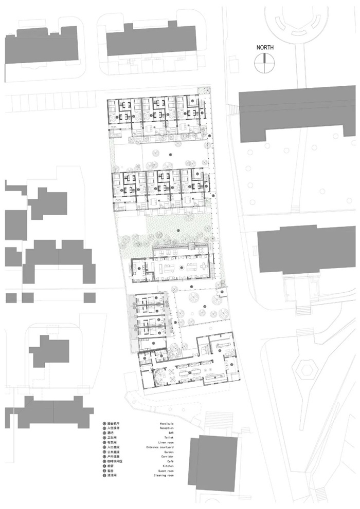 原本楼栋之间庭院留下的生长多年的大型水杉树别具韵味,但是原本的庭院空间不大不小没有被充分利用。而原本隔间式的宿舍户型将其改为客房后,空间局限性也很大。经过分析后,除了将内部户型结构重新进行设计与改造外,建筑师还决定将几个庭院也重新进行分配。1#庭院开放出来作为餐厅的延伸,形成休闲与就餐的公共庭院。2#与3#庭院则将其分割成公共活动的大庭院与客房专属的小庭院,增强空间的公共与专属使用价值的同时,也让水杉树与院落可以更好的相互交融。