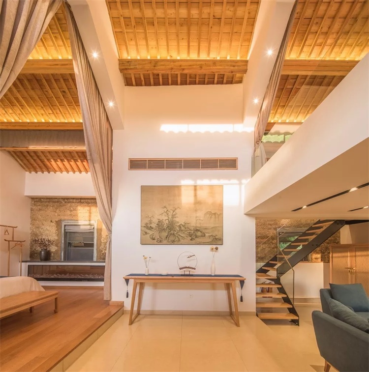 整栋房子里只安排了三个房间,开放式的空间设计,挑高的手法,大量的原木横梁与土夯墙,再搭配中式风格的条案、水墨画和雅致的装饰,显得格外高贵与气派。
