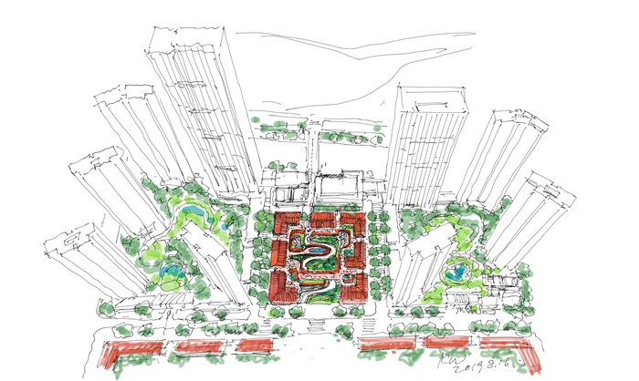 设计保留原城市设计的轴线结构,通过一条贯穿南北的中轴线连接临江和街坊两个高价值城市空间。住宅塔楼依次布局于中轴两侧,形成居住生活的东西两坊;奢华酒店和超甲级办公的商务塔楼沿江设置;而容纳会议中心、体育中心和商业街区的休闲商业空间位于中部,作为整个片区的衔接。设计通过体量错动及朝向调整,让各塔楼景观资源最大化,尽享江景、坊景、院景多维度景观。