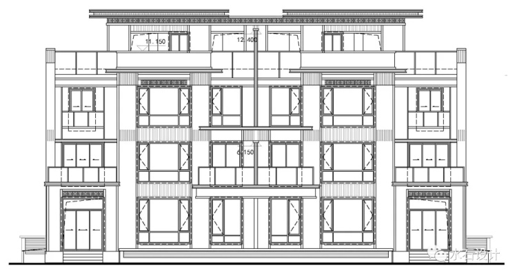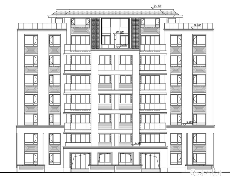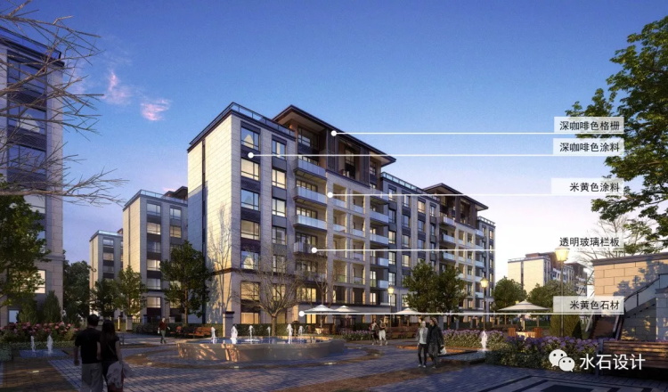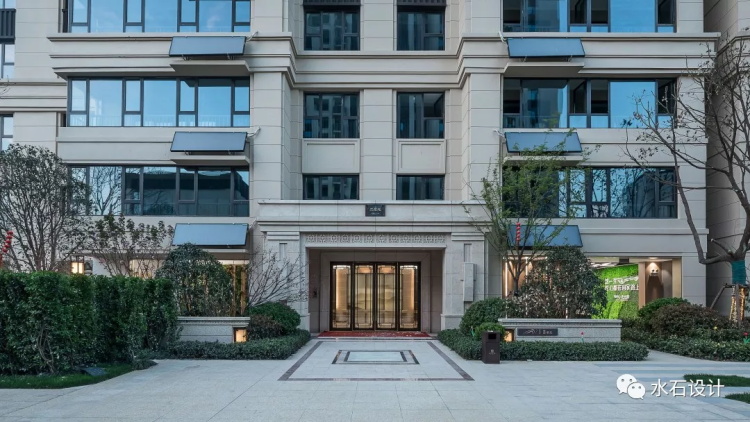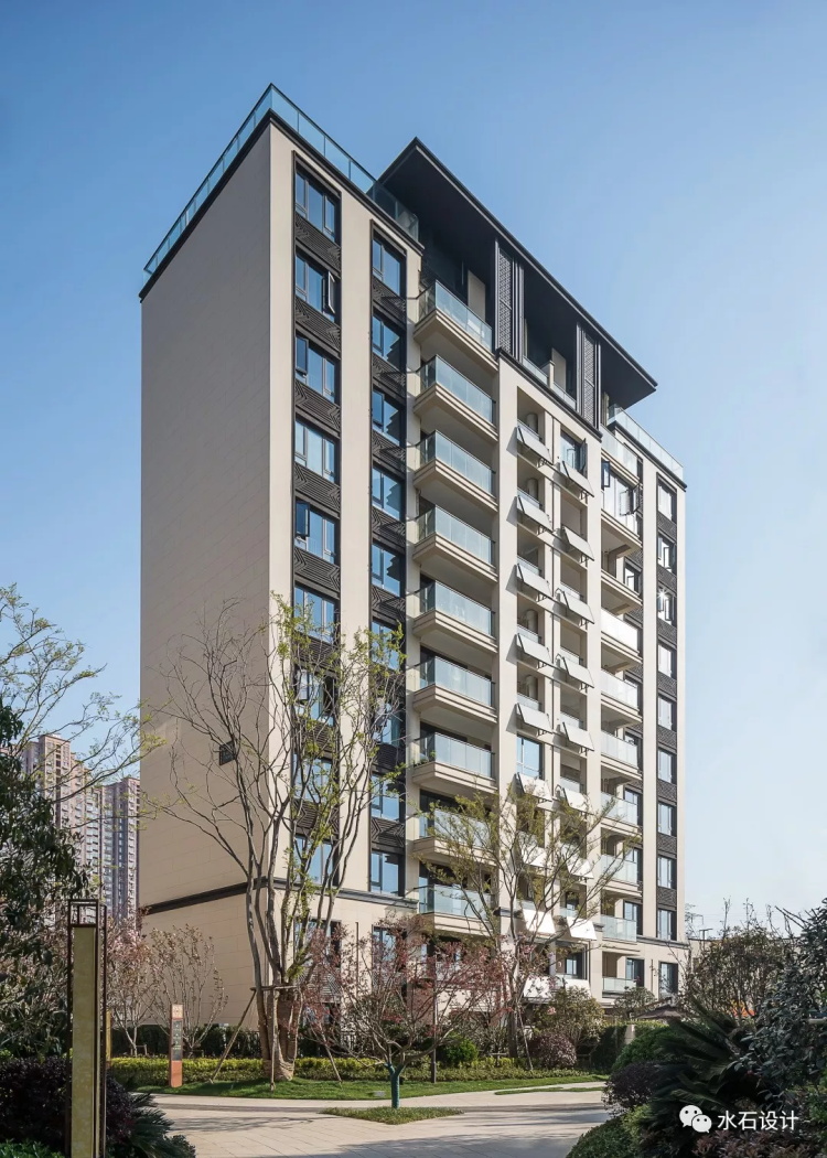 洋房的立面采用简约的三段式处理,建筑利用建筑形体的穿插及现代的玻璃栏杆的设计使得建筑具有轻盈雅致的效果,很好的满足了现代人的生活方式;洋房的基座部分采用石材加局部金属板的设计,顶部出挑的飞檐中点缀穿孔金属百叶形成头部的视觉焦点。