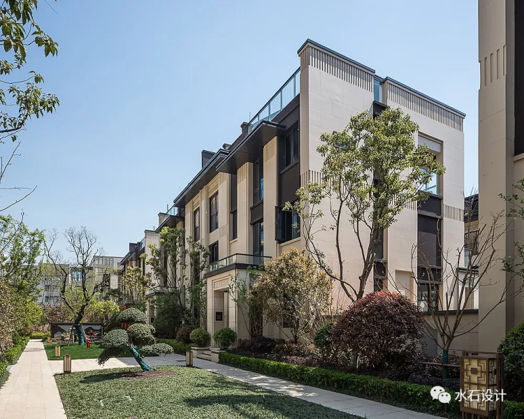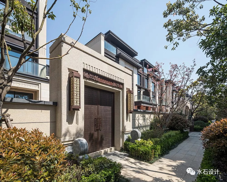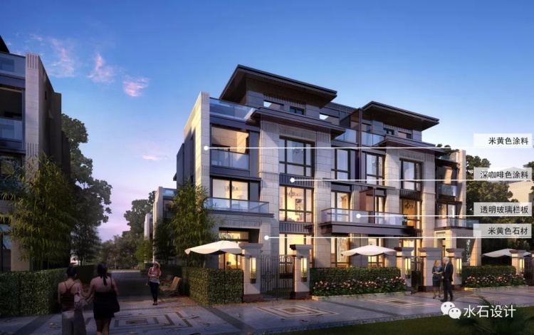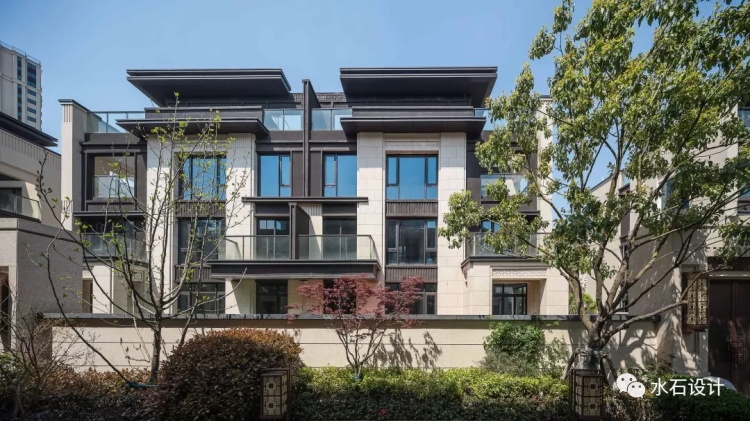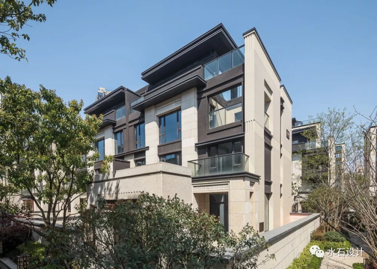 建筑采用新亚洲建筑风格,别墅使用典雅的米色石材,点缀部分咖啡色金属漆,使得建筑具有雅致的立面效果,顶部出挑的飞檐,具有传统建筑神韵。