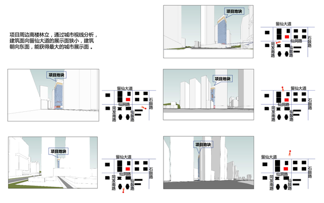 该项目基地是高密度城区典型的小地块,几无腾挪体量余地。作为城市片区超高层方阵中的一员,砺剑大厦在左邻右舍间或避或迎,精准站位,完成城市秩序重要的一块拼图。