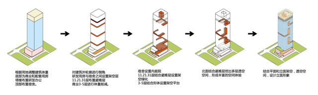 从上至下,砺剑大厦的功能由宿舍、办公、商业配套组成,不同功能之间的衔接层成为形势变动的机会;超高层的避难层不可避免地打断纵向连续性,这一现实也被利用为形势变化契机。两者结合,全楼上下出现5处可落实的变化组合。