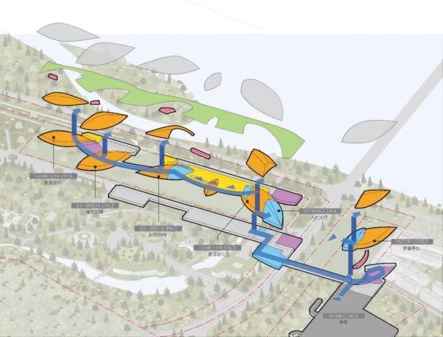 展馆间通过南向玻璃廊子相互连接,人在连廊中移动,所见窗外景色随着景观变化步移景异。