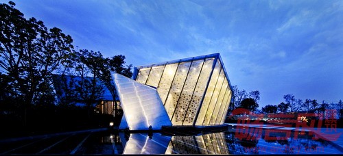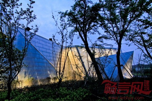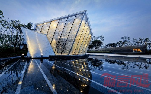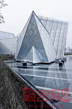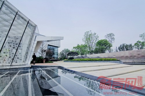 在一片半弧形的空地之上,多条轴线渐次而生,相互交错,衍生出不同方向角度的片墙,看似繁多,却围绕在其内在的规律中,捧出从大地中生出的钻石。