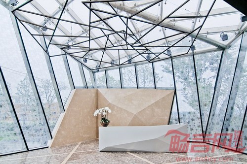 玻璃体正如其所寓意的钻石,表面棱角尖锐而异形,在三维空间中自由变幻,终形成了可托于掌中的一颗精致的明钻。