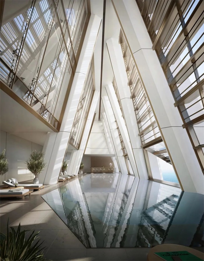 结构转换位置的24F-26F是空中配套空间,同时也是办公与住宅的功能转换区。ARUP设计师运用斜柱转换结构和局部外挑的立面语言对此处空间进行着重刻画。配套空间内部功能丰富,涵盖娱乐、健身、会议、活动、餐饮、社交等空间,并用一个三层通高的中庭特色楼梯空间将各个功能联系起来,透过宽敞的玻璃立面可以俯瞰北部的城市景观。