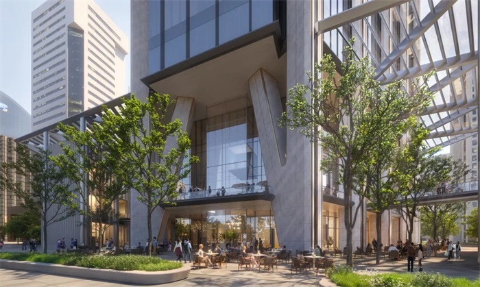 项目通过底层架空的空间形式引入人流,加强周边地块的连接,将街区式的业态吸纳到基地内部,打造文化艺术的空间。力求融入以行政办公、金融商务、商业服务、文化休闲为定位的片区功能中,打造重点发展总部经济、金融、国际商务、时尚消费等产业的国际商务中心、时尚消费中心、国际影响力的总部集聚区。