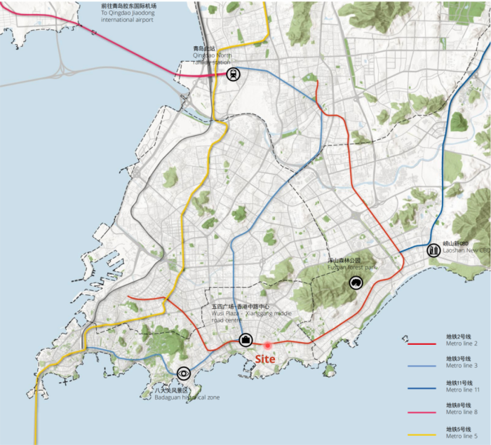 项目位于青岛市市南区沿海一线,距离青岛市政府800米,五四广场600米,距离海岸线仅400米,处于南京路沿线的核心地段,是青岛市政治、经济和文化旅游中心的黄金地块,是衔接青岛市政府及奥帆中心的重要节点,也是激活城市中心区的重要引擎。