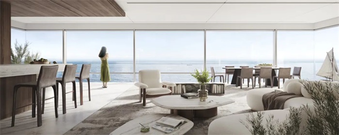 为保证业主拥有无遮挡的360°观景体验,与幕墙顾问紧密配合,采用最新技术,最大限度保证玻璃板块尺寸。客厅提供15米的无柱连续单一朝向面宽,和21米的无柱连续转角面宽,为用户呈现极致的城市山海景观。