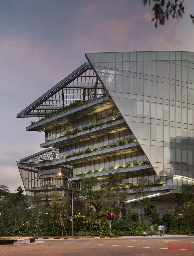 另外,楼层两翼的终端和花园处戛然而止,两边标高也逐渐降低,每层楼层都看似悬于下一楼层之上,并形成了开放的景观平台。如此设计不但使建筑外形十分具有视觉冲击力,同时减少了日照热能。在「马蹄铁」的尾端,一层悬于一层的茂密植被和绿色平台进一步为办公楼提供了遮荫蔽雨的功能,也使整座大楼成为一处美妙的景观。