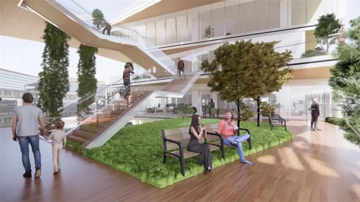 这座四面拥有不同弧度的建筑极具辨识度,且四面各有一个广场空间,并被赋予不同的主题,与相邻环境形成紧密呼应。其中,最大的广场空间位于建筑南侧,这里同时也是人们开启园区独特体验的最重要的抵达点。朝向湖景设置的下沉广场,不仅拥有健身房和母婴室等周全的配套服务,还有利于将采光带到室内深处,优化地下停车体验。当人们穿过任意广场步入建筑内部,将会置身于一座双层挑高、优雅大气的中庭空间,办公功能被统一设置在建筑的外围,目的是为员工提供绝佳的景观视野和具有修复力的办公环境,让员工接触更多的自然和阳光,缓解工作压力、调节情绪、修复疲惫状态,同时包括会议室、健身房、展览空间在内的各种办公配套功能围绕中庭进行布局,方便服务于员工及访客群体。