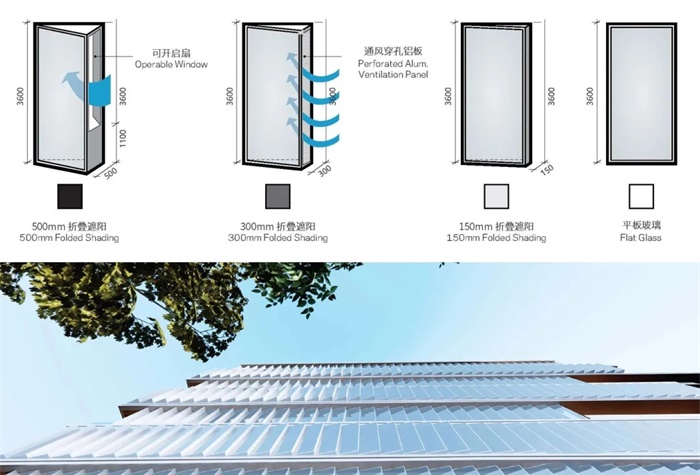 富于创新的折板外墙系统被纳入到办公楼设计当中。南北立面采用锯齿形折叠立面系统,营造出清晰的立面表达。这种立面系统的基本模块由一个有角度的玻璃视觉面板和一个不透明的侧面板组成。一方面,倾斜的玻璃视觉面板的位置与场地的最佳视野方向相呼应。另一方面,不透明面板通过集成的可开启通风口提供遮阳保护,便于自然通风。较宽的退台位于建筑物的东侧和西侧。侧面露台不仅具有遮阳效果,还有助于室内的人们便捷进入户外露天环境,并接触自然。