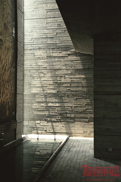 博物馆藏品以石刻为主题,建筑则希望表现一部“人造石”的故事。针对当地低下的施工技术以及事后改动随意性极大的情况,采用“框架结构、清水混凝土与页岩砖组合墙”这一特殊的混成工艺,利用组合墙内层的砖作为内模以保证混凝土浇筑的垂直度,同时成为“软衬”以应付事后的开槽改动等。整个主体部分清水混凝土外壁采用凸凹窄条模板,一是为了形成明确的肌理,增加外墙的质感和可读性,同时,粗犷而较细小的分格可以掩饰由于浇筑工艺生疏而可能带来的瑕庇。希望既满足建筑追求又解决中国的问题。