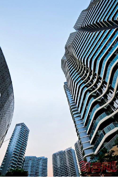 所有建筑在竖向上高低依次变化,带来起伏的天际线。住宅通过阳台的左右错动来展现连绵变化。会所、商业以及幼儿园的立面也都遵循同一种语言。这是一个整体的,充满活力和美感的社区。