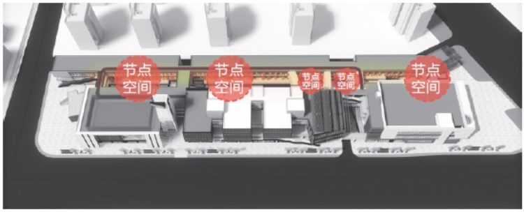 建筑使用走道及连廊将东西两部分进行联系,人流量大的地方适当增加走道宽度,形成活动平台。结合内街的楼梯设置,形成每层的游览路径,构成步行空间系统的骨架并将建筑各个空间进行联系。此外在步行过程中,空间局部放大或两层通高让建筑内部有更好的视野,进一步增强空间联通的效果。