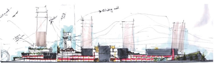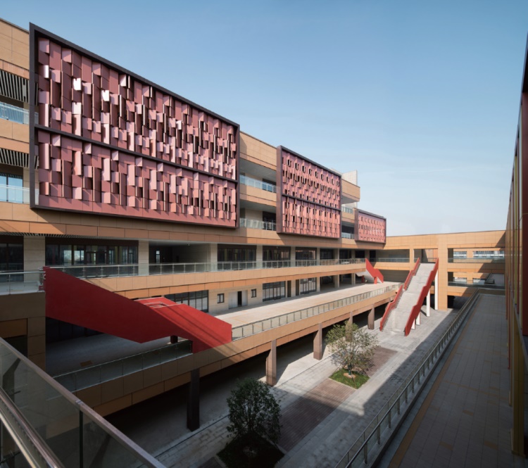 建筑的体型分成三段来处理:南段是体育活动场馆,高大厚重;中段上部是文化活动区,由四个灵活的体块堆叠而成;北段是商业街主入口,3层的体量强调雕塑感;从四桥看去,建筑的形态创造了一种强烈的节奏和韵律,收放自如、变化丰富的界面形态减轻了建筑体量对城市界面的压迫感。与此同时,一个39m高的构筑物被添加其中,使其成为平缓天际线中的最高点,具有强烈的标志性。