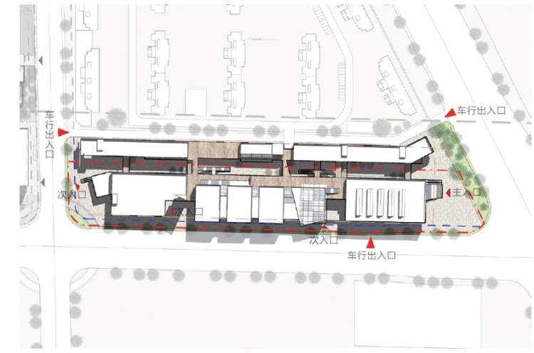 本案是一座社区服务中心与邻里商业相结合的综合体,其中商业功能为15 000㎡。场地为一条南北向的狭长地带,南北向约320m,而东西向仅有70m;建筑限高24m,容积率2.0,并且东西是分为两个产权的地块,建筑不得跨越。针对这些局限,建筑沿场地边界生成长条形的体量,并在其中生成内街,用分段主题的方法把形体切分成三个体块并用连廊相连。建筑南北两侧的体块向内缩进形成入口广场,以减少对街角的压迫感。植入缓步楼梯,串联商业动线并模糊建筑的垂直分层,形成悠游的立体城市公园。如何将社区中心这一建筑类型从强烈的行政属性转变为亲民自由的状态,是我们一开始就积极面对的问题。