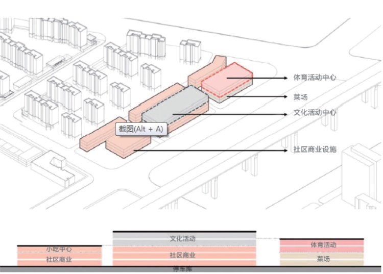 社区中心中商业部分配备多个业种:餐饮类配备小贩中心和其他餐饮店铺,市民服务类配备了美发、洗衣、药店和家庭服务等,还增加了文化娱乐等功能。同时,文化活动类功能包含多功能厅、电子阅览室、培训辅导、表演排练和文艺创作等,体育中心配置了健身房和各类球类场馆,零售、休闲娱乐功能与便民服务功能相得益彰。更值得一提的是,文化活动和体育功能的植入增强了周边安置居民的参与感,提高了建筑的亲民性,进一步丰富了社区中心的功能,形成一个被居民接受的“城市公园”。建筑因多种功能与不同活动需求而形成的不确定性,打破了行政功能的空洞内涵,消除了权利空间的象征性印记,使建筑更加亲民。