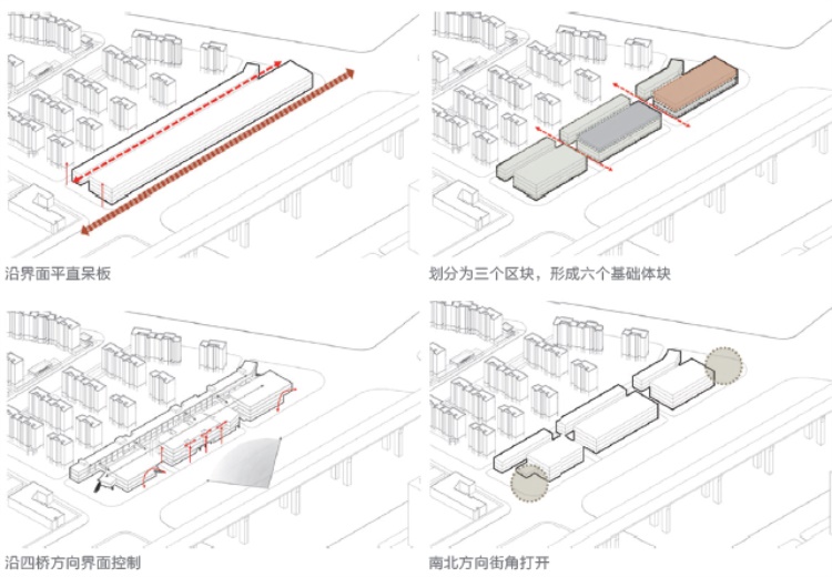社区中心建筑作为城市中的市民活动中心,需要增加其与城市的连通性,以便更好地向市民开放。我们将建筑切割成三个部分来应对狭长基地带来的消极影响,同时三个区域分别对应不同的功能主题。加之东侧商业带被切割形成六个建筑体量,通过连廊、走道进行联系。通过一系列操作,西侧的街道出现了两个大的缝隙,城市空间与商业空间在这里相互渗透。同时,界面也利用立面的凹凸,使巨大的体量更灵活多变。在南侧和北侧街角的位置,体量后退并旋转,形成进入商业内街的入口广场。