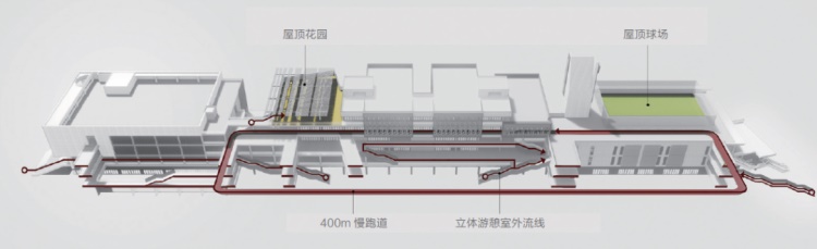 立体城市公园的内部流线打破楼层限制,通过垂直交通吸引人流到达上部楼层,在提升整体空间价值的同时,让使用者在空间中体验步行的乐趣。可经由南侧入口处的大台阶到达菜场所在的二层活动平台,再由自动扶梯和直跑楼梯至三层屋面;屋顶的环形慢跑道和花园又是一处可供居民活动的亲民空间。