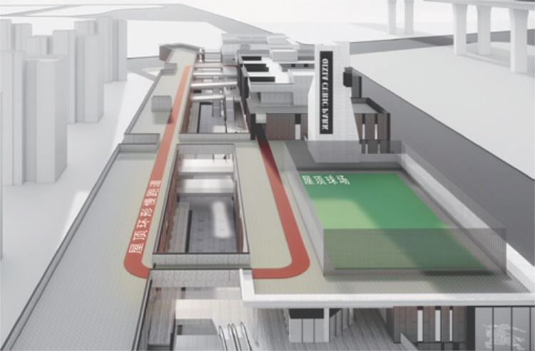 建筑中的体育活动中心功能延伸至四层的走道和三层的屋面,形成400m的环形慢跑道,并沿途设置了五人制足球场地。室内体育活动场地向室外延伸,散步至此的市民可以接触到阳光和新鲜空气,轻松愉悦地体验运动的乐趣。屋面上还有一处金属棚架覆盖的屋顶花园,棚架可布置装饰或藤蔓,居民在此处可以举办各类活动。我们试图用丰富的活动元素来调剂建筑的纪律性功能网格,使建筑更具自由的内涵,并避免行政功能型建筑的拘谨氛围。希望这个“立体城市公园”可以唤起安置居民的认同感,或许在开业后会成为石埠桥片区最受欢迎的公共场所之一。