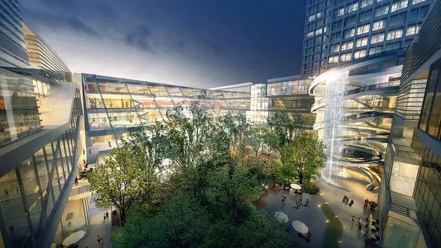 塔楼脚下仿照真实生态雨林打造都市绿谷,营造出“摩天楼中的生态雨林”之感,崎岖不平的天然岩壁,潺潺流水汇成瀑布,寂静而清澈的水潭,每一个元素都营造出诗意的休闲空间。