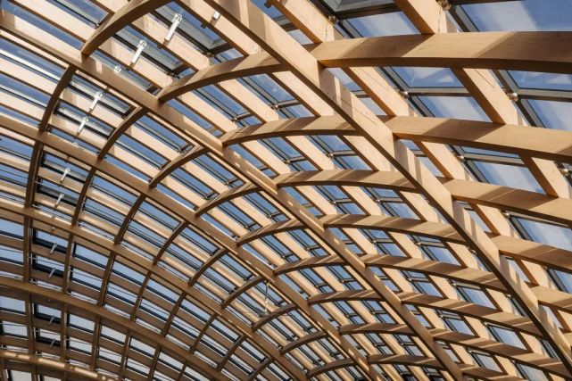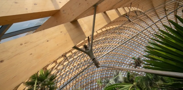 太原植物园展览温室项目材料的使用,实现了低碳排放的目标。由三层双向交叉木梁以及单层不锈钢拉索组成了温室单体的复杂结构体系,可以认为是世界上此复杂体系中跨度最大的建筑物。