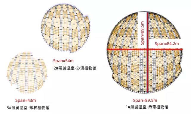 三座温室的圆拱跨度分别为89.5米、54米、43米,高度分别为29.5米、20.9米和13米。其中,跨度89.5米的是世界上最大的木格结构构筑物之一。每座穹顶下都设有双曲胶合木梁,形成两到三层交错的结构。拱顶中安装双曲玻璃板,部分窗扇可以开启。